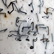 Bits of broken glass collected on the stencil that I sprayed in an alleyway last year.